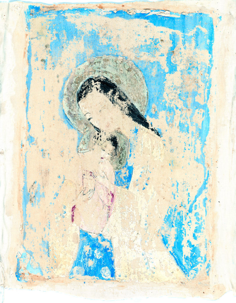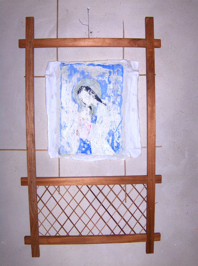 La peinture du suaire est créée à partir des techniques de restauration de la fresque sur tissus et présentée dans un cadre en bambou.
